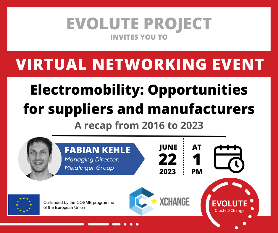 COMET ha il piacere di invitarti al prossimo webinar del 22 giugno alle ore 13.00 organizzato nell’ambito del progetto di cui siamo partner EVOLUTE: Electromobility: Opportunities for suppliers and manufacturers.
