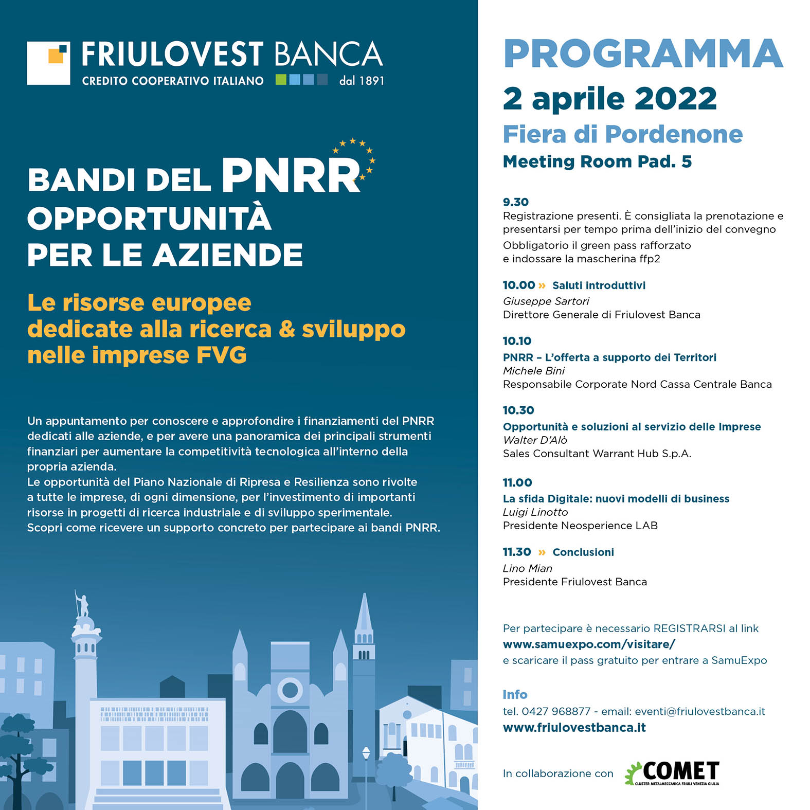 COMET segnala l’evento organizzato da Friulovest Banca e il Cluster: “Bandi del PNRR opportunità per le aziende” di sabato 2 aprile 2022 nella Meeting Room del pad. 5 a Pordenone Fiere, durante i Samu Digital Days a SamuExpo.