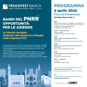 L’evento “Bandi del PNRR: opportunità per le aziende” di Sabato 2 aprile 2022 dalle ore 10.00 alle ore 12.30 – in collaborazione con Friulovest Banca – nella Meeting Room del pad. 5 e inserito nella rassegna Samu Digital Days di SamuExpo. Leggi il programma dell’evento.