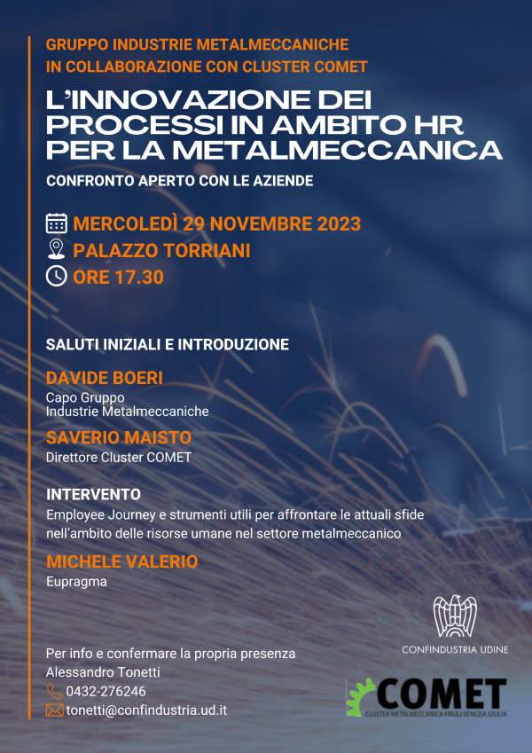 COMET ha il piacere di invitare tutte le aziende della Metalmeccanica regionale all’incontro “L’innovazione dei processi in ambito HR per la Metalmeccanica” di Mercoledì 29 novembre ore 17:30, che verrà presentato a Udine presso Palazzo Torriani al gruppo metalmeccanico di Confindustria Udine.