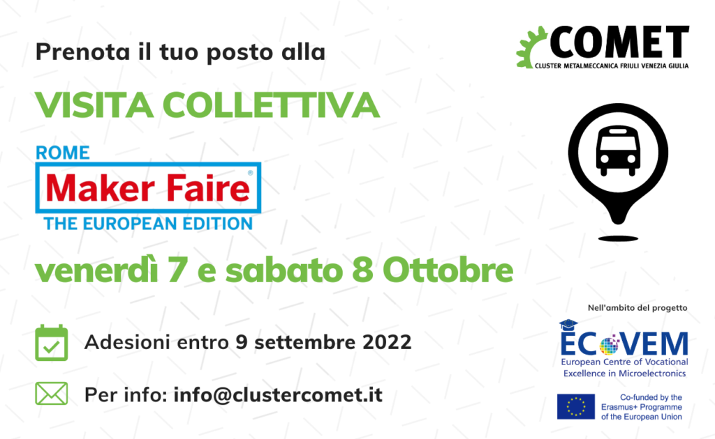 Nell’ambito del progetto europeo Erasmus + ECOVEM stiamo organizzando una collettiva di aziende in visita alla Fiera Maker Faire di Roma nelle giornate di venerdì 7 e sabato 8 ottobre per scoprire un settore di crescente interesse per le aziende del territorio.
